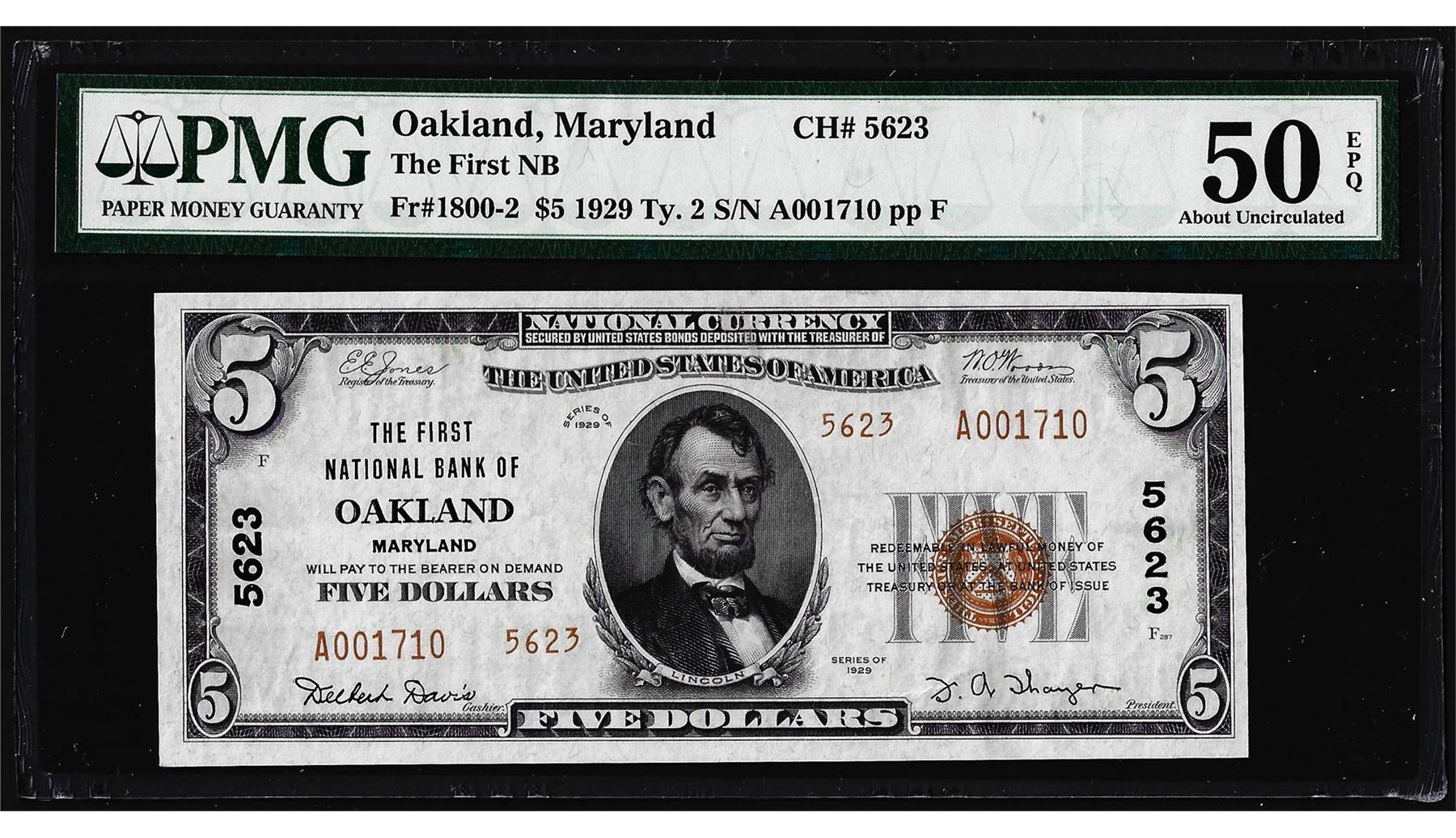 One 1929 $5 First NB of Oakland, MD CH# 5623 National Note PMG About Uncirculated 50EPQ. PMG Certified.