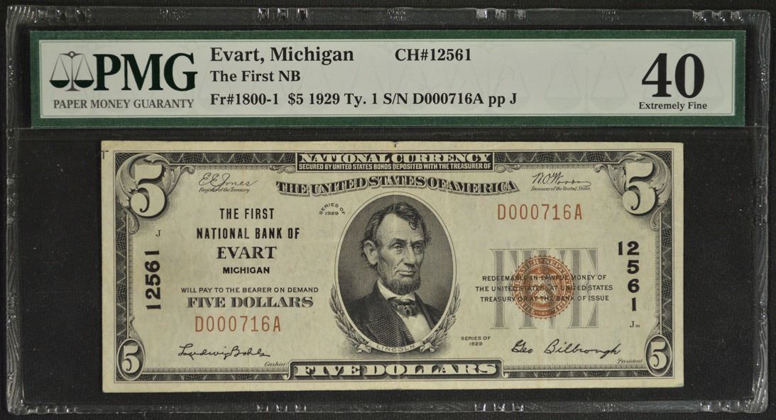 One 1929 $5 First National Bank of Evart Michigan Note PMG 40.