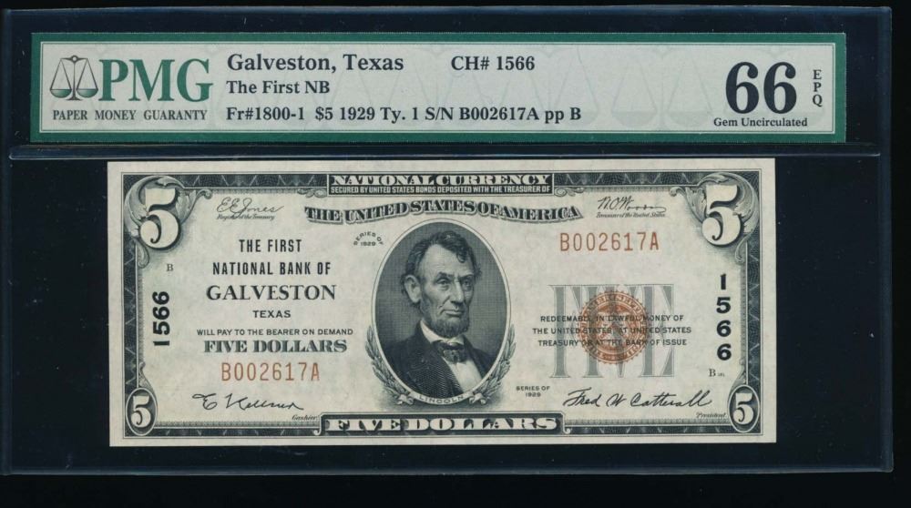 One 1929 $5 Galveston National Bank Note PMG 66EPQ.