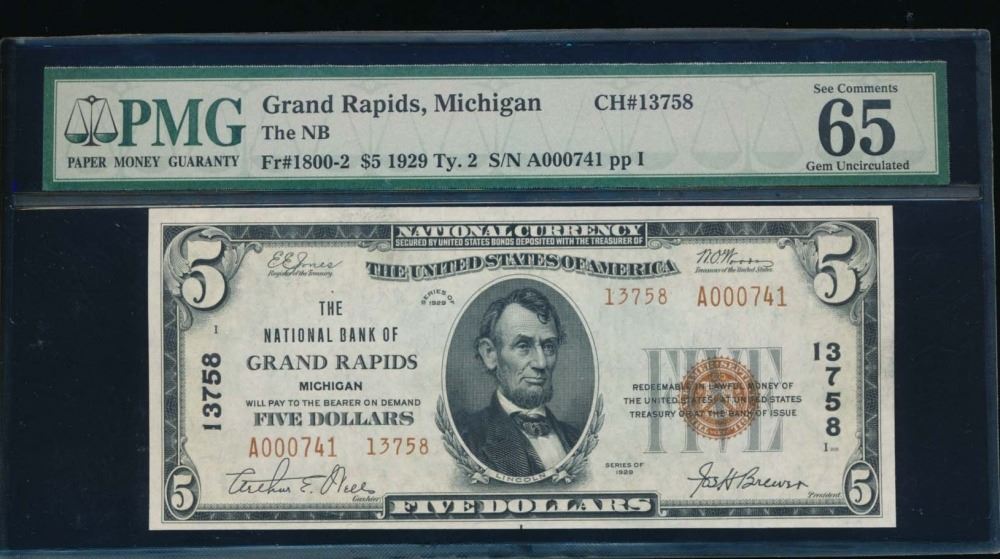 One 1929 $5 Grand Rapids National Bank Note PMG 65EPQ.