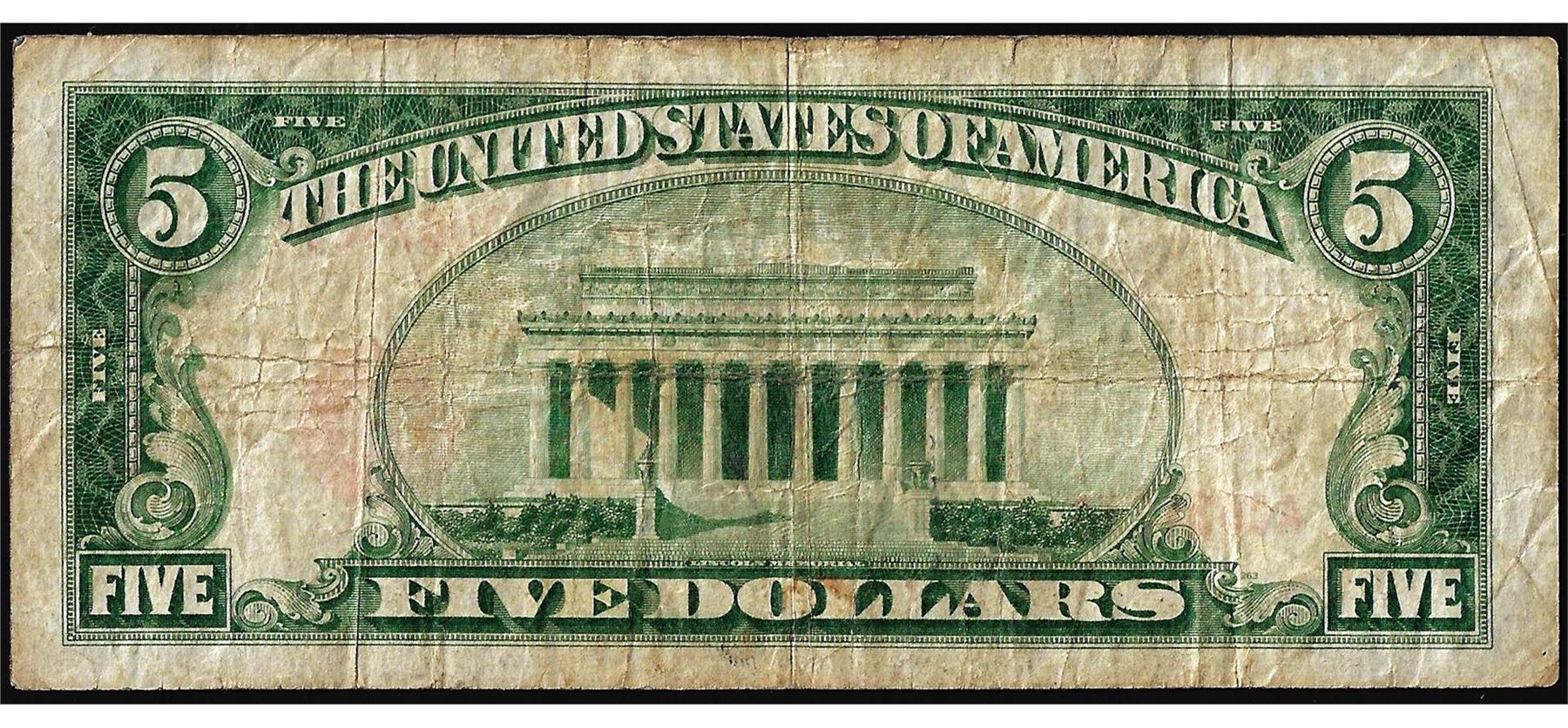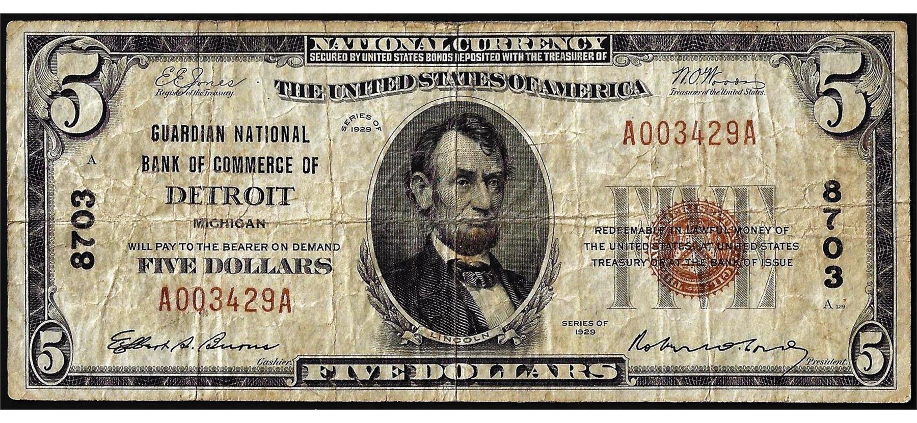 One 1929 $5 Guardian NB of Commerce of Detroit, MI CH# 8703 National Currency Note.