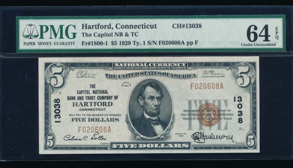 One 1929 $5 Hartford National Bank Note PMG 64EPQ.