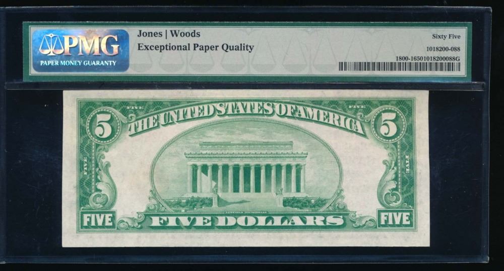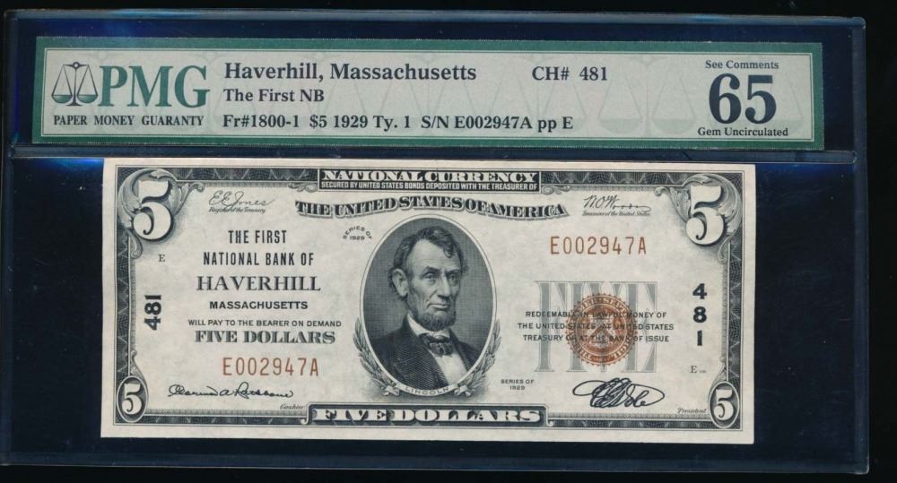 One 1929 $5 Haverhill MA National PMG 65EPQ.