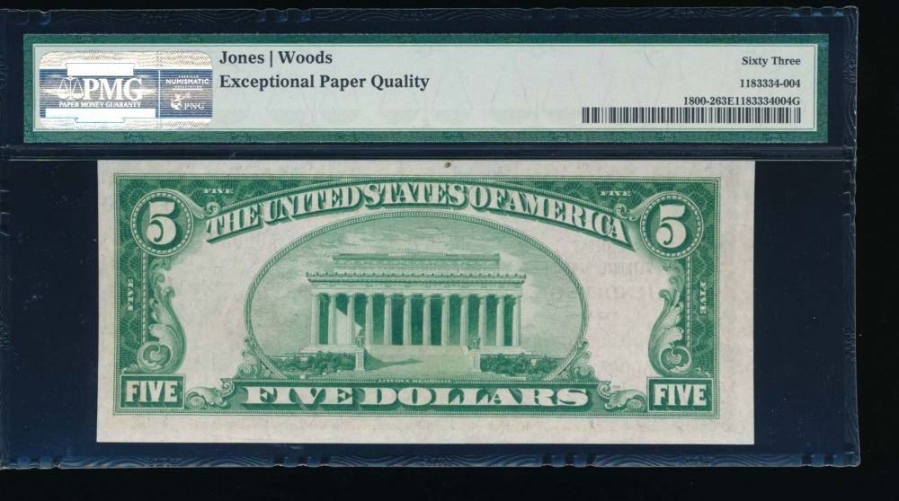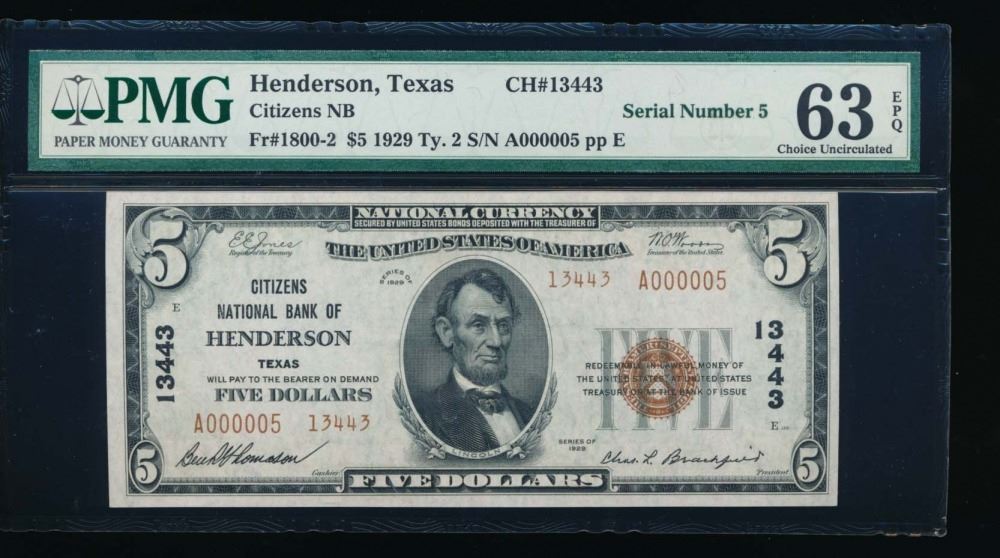One 1929 $5 Henderson National Bank Note PMG 63EPQ.