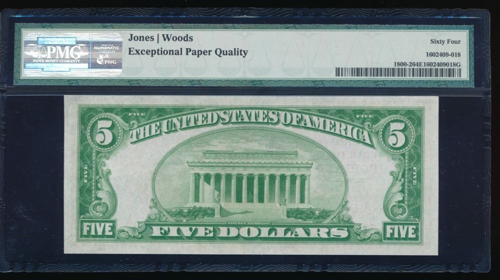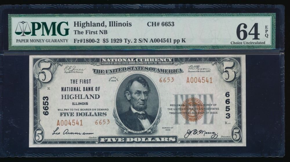 One 1929 $5 Highland National Bank Note PMG 64EPQ.