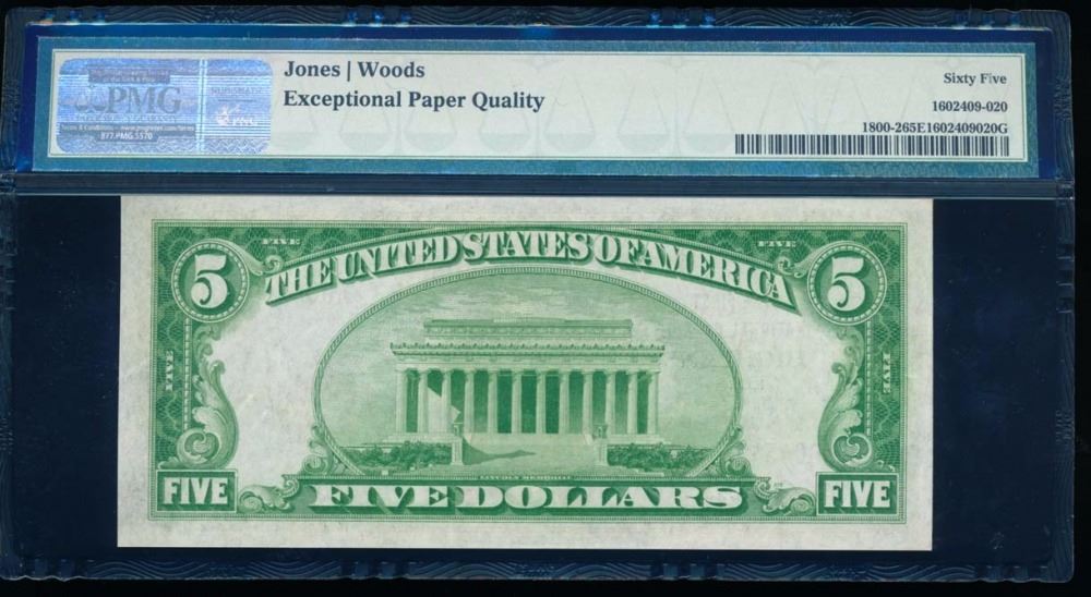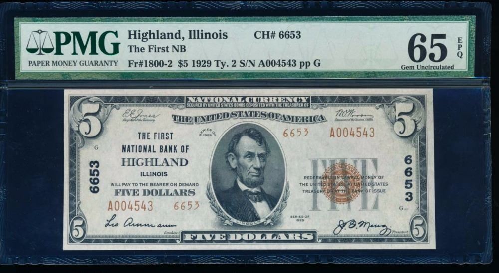 One 1929 $5 Highland National Bank Note PMG 65EPQ.