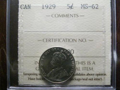 1929 5¢ ICCS MS62. A strong strike example with full beads.