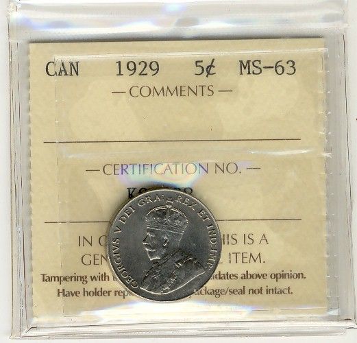 1929 5¢ ICCS MS63. Lots of lustre and full band.