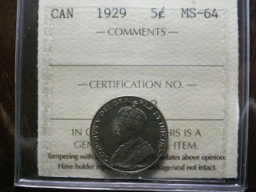 1929 5¢ ICCS MS64. A strong strike example with full beads. Scarce!