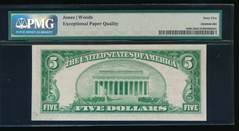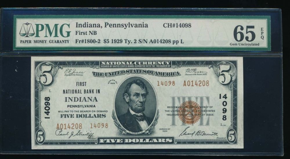 One 1929 $5 Indiana National Bank Note PMG 65EPQ.