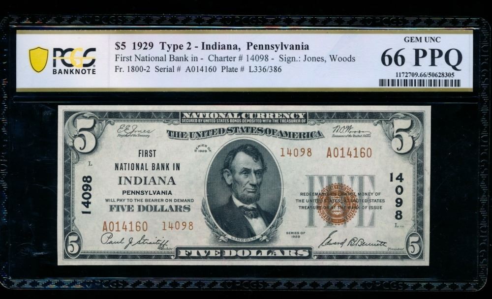 One 1929 $5 Indiana PA National PCGS 66PPQ.