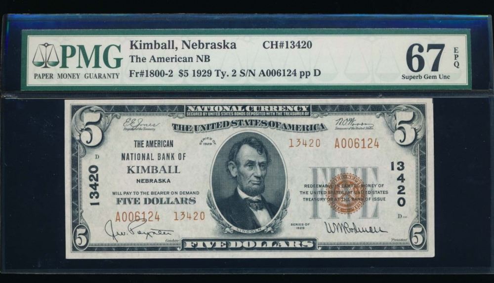 One 1929 $5 Kimball National Bank Note PMG 67EPQ.
