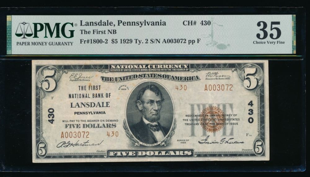 One 1929 $5 Lansdale PA National PMG 35.