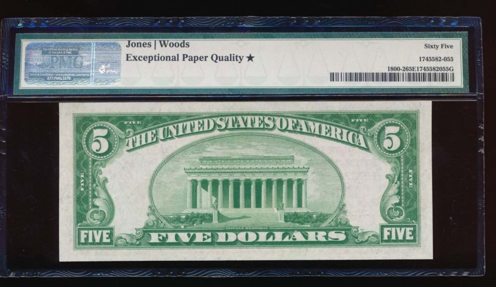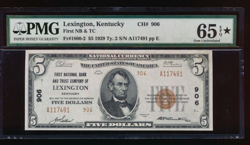 One 1929 $5 Lexington National Bank Note PMG 65EPQ.