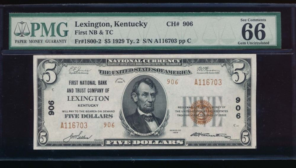 One 1929 $5 Lexington National Bank Note PMG 66EPQ.