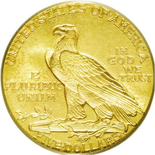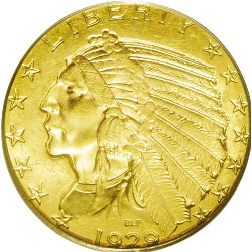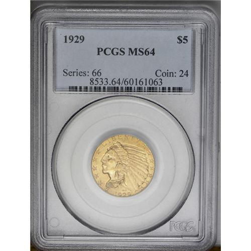 <B>1929<$5> MS64 PCGS.</B></I> As rare and well-known as this date is to collectors, it is only ranked as the ninth rarest date according to Akers. This is because the entire mintage was saved from circulation, and eventually stored in vaults. Most were later melted, although some examples were saved from the melting pot and entered numismatic circulation. This example is a sharply struck specimen with frosty yellow-gold luster and excellent visual appeal.