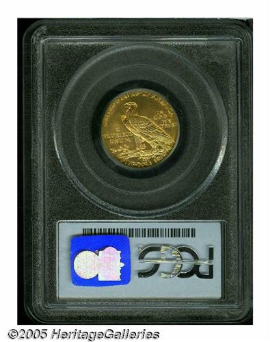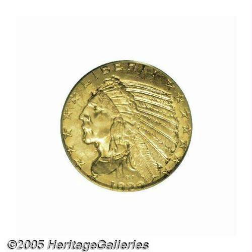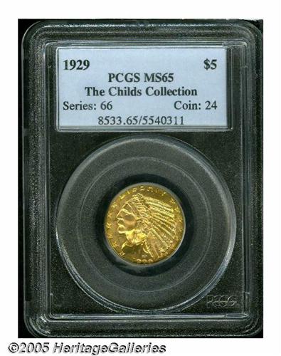 <B>1929<$5> MS65 PCGS.</B></I> This is the final year of issue for this popular series, and a very rare coin indeed. Most were gathered up and melted during the gold seizure of 1933. Precious few survived at all, let alone in Gem condition. The present coin shows strong luster and excellent surfaces required to obtain this coveted PCGS grade. To date, the combined NGC and PCGS population reports show a meager 13 pieces graded this high, with none seen finer by either service.<BR><I>Ex: Bowers and Merena's Sale (Walter H. Child's Collection, August, 1999), lot 772.</B></I>