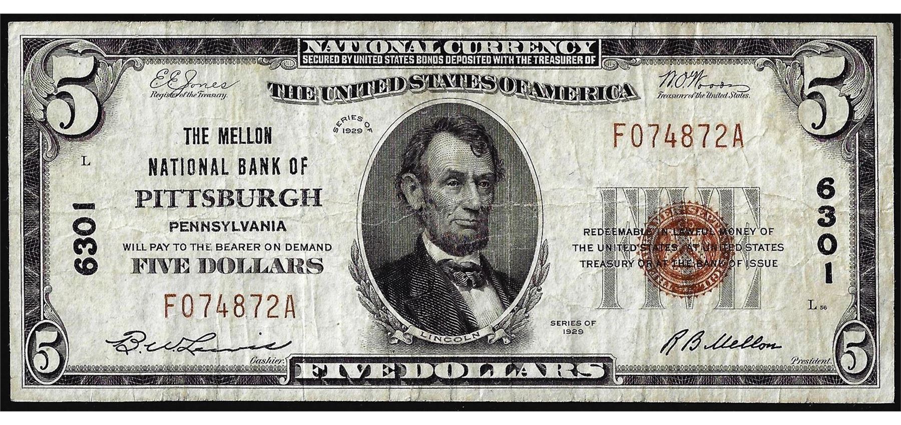 1929 $5 Mellon NB of Pittsburgh, Pennsylvania CH# 6301 National Currency Note