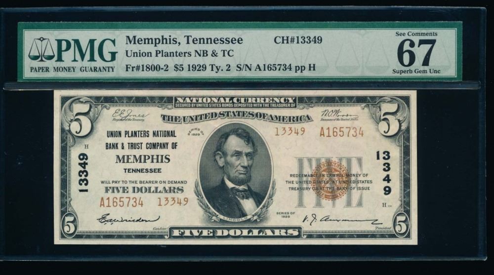 One 1929 $5 Memphis National Bank Note PMG 67EPQ.