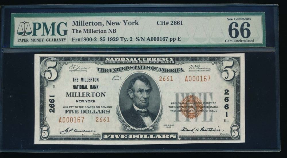 One 1929 $5 Millerton National Bank Note PMG 66EPQ.