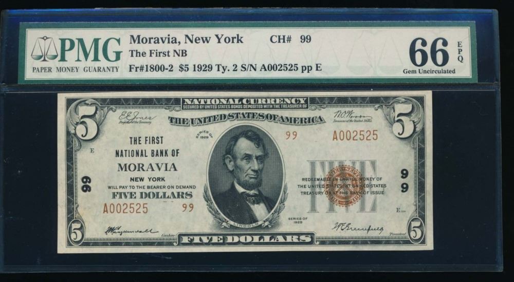 One 1929 $5 Moravia National Bank Note PMG 66EPQ.