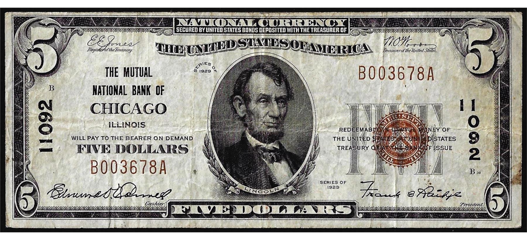 One 1929 $5 Mutual NB of Chicago, IL CH# 11092 National Currency Note.