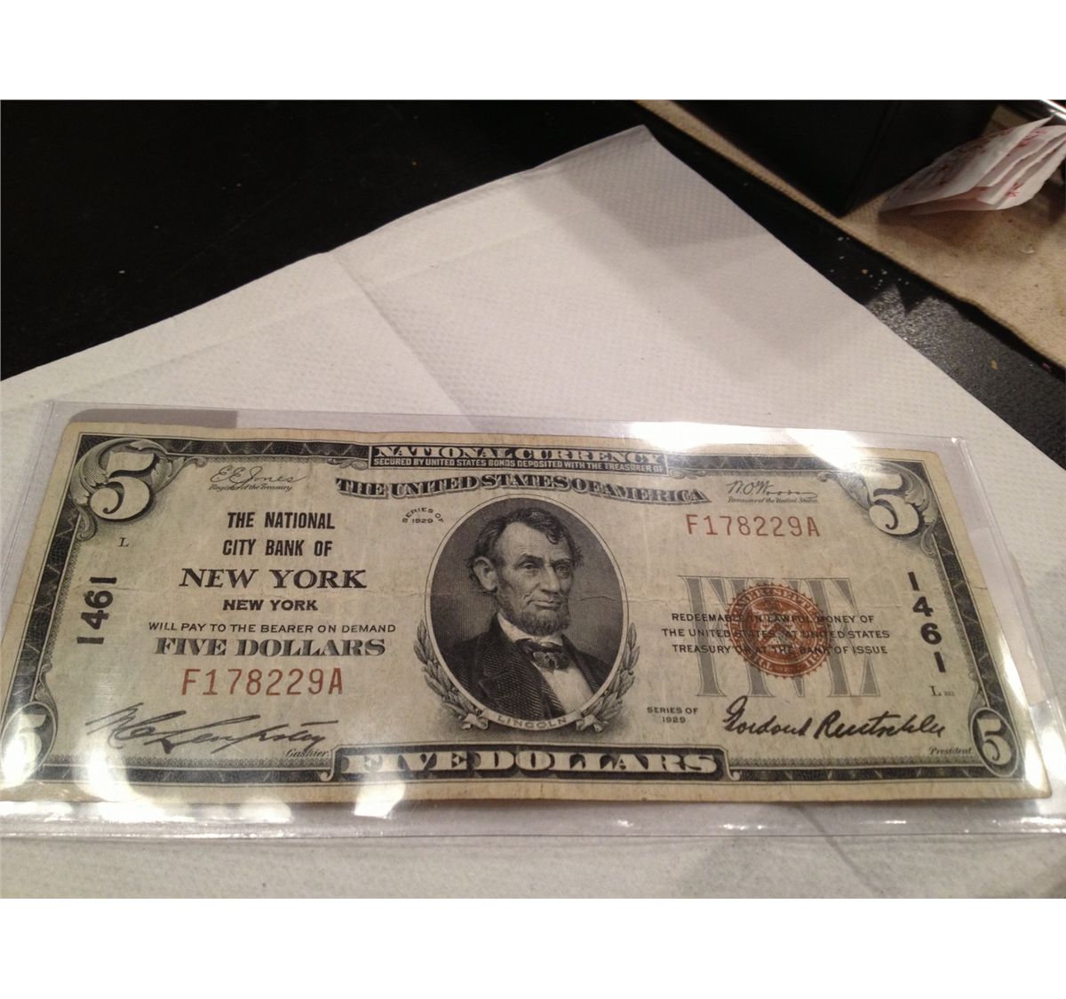 1929 $5 NATIONAL CITY BANK OF NY NATIONAL CURRENCY