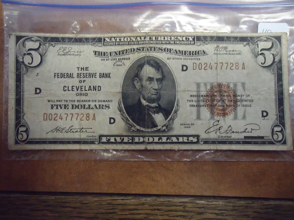 1929 $5 NATIONAL CURRENCY CLEVLAND BROWN SEAL