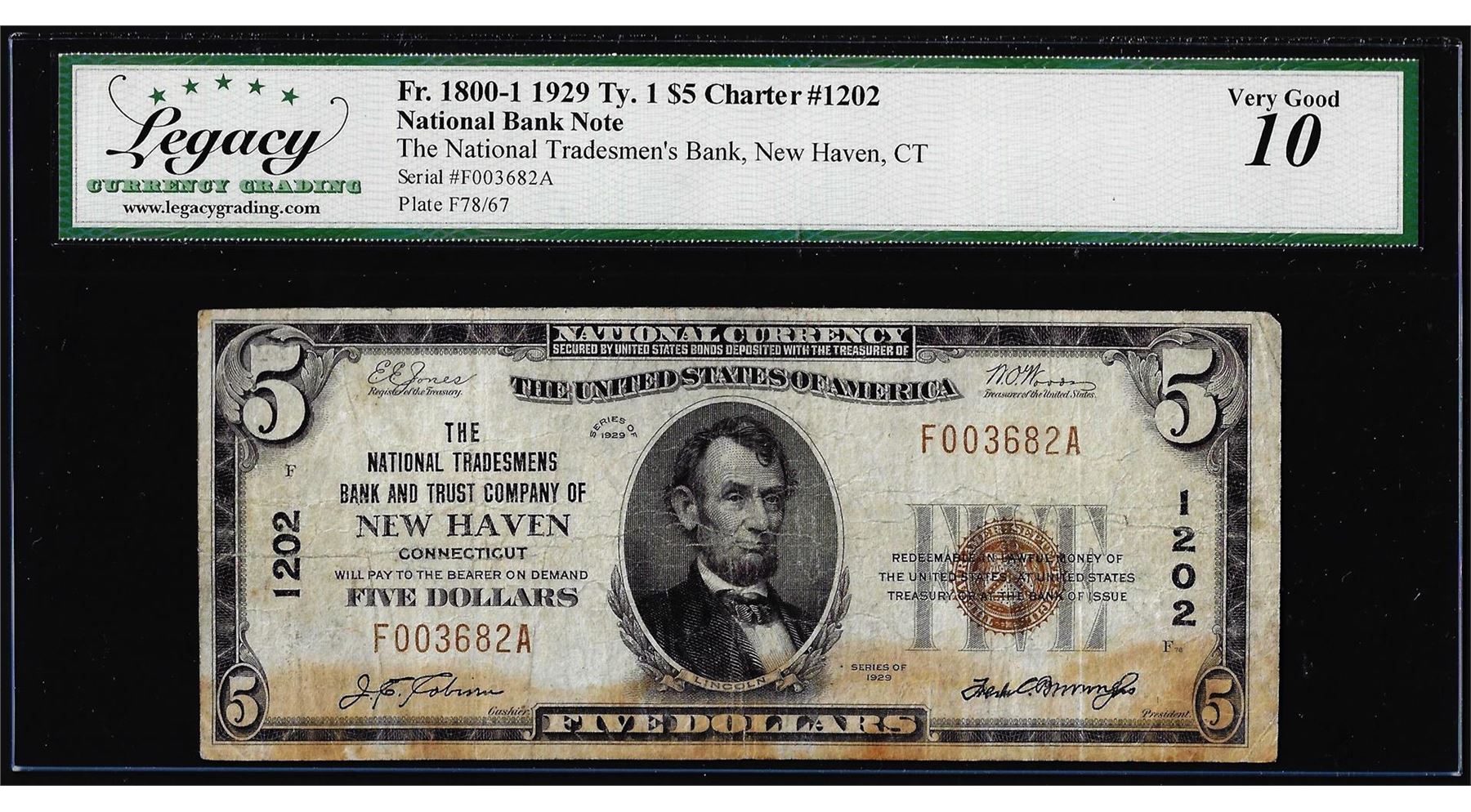 One 1929 $5 NB New Haven, CT CH# 1202 National Currency Note Legacy Very Good 10. Legacy Graded.