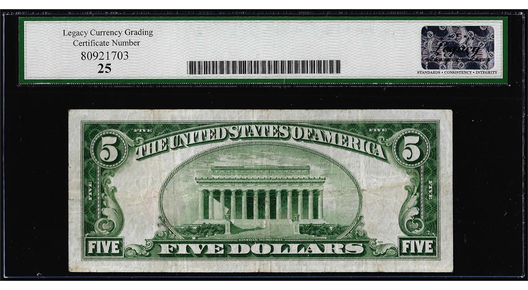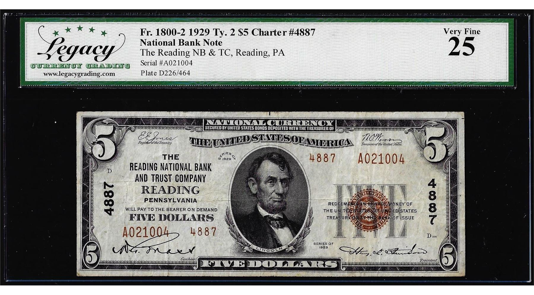 One 1929 $5 NB Reading, PA CH# 4887 Fr.1800-2 National Currency Note Legacy Very Fine 25. Legacy Graded.