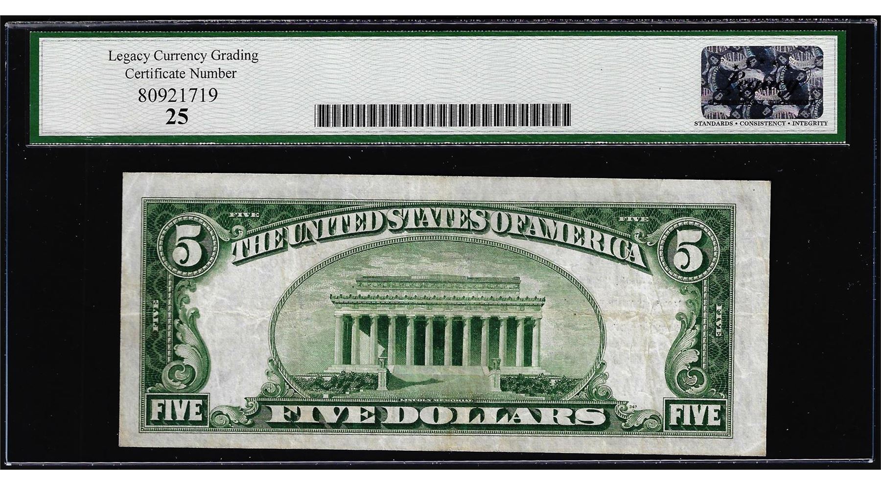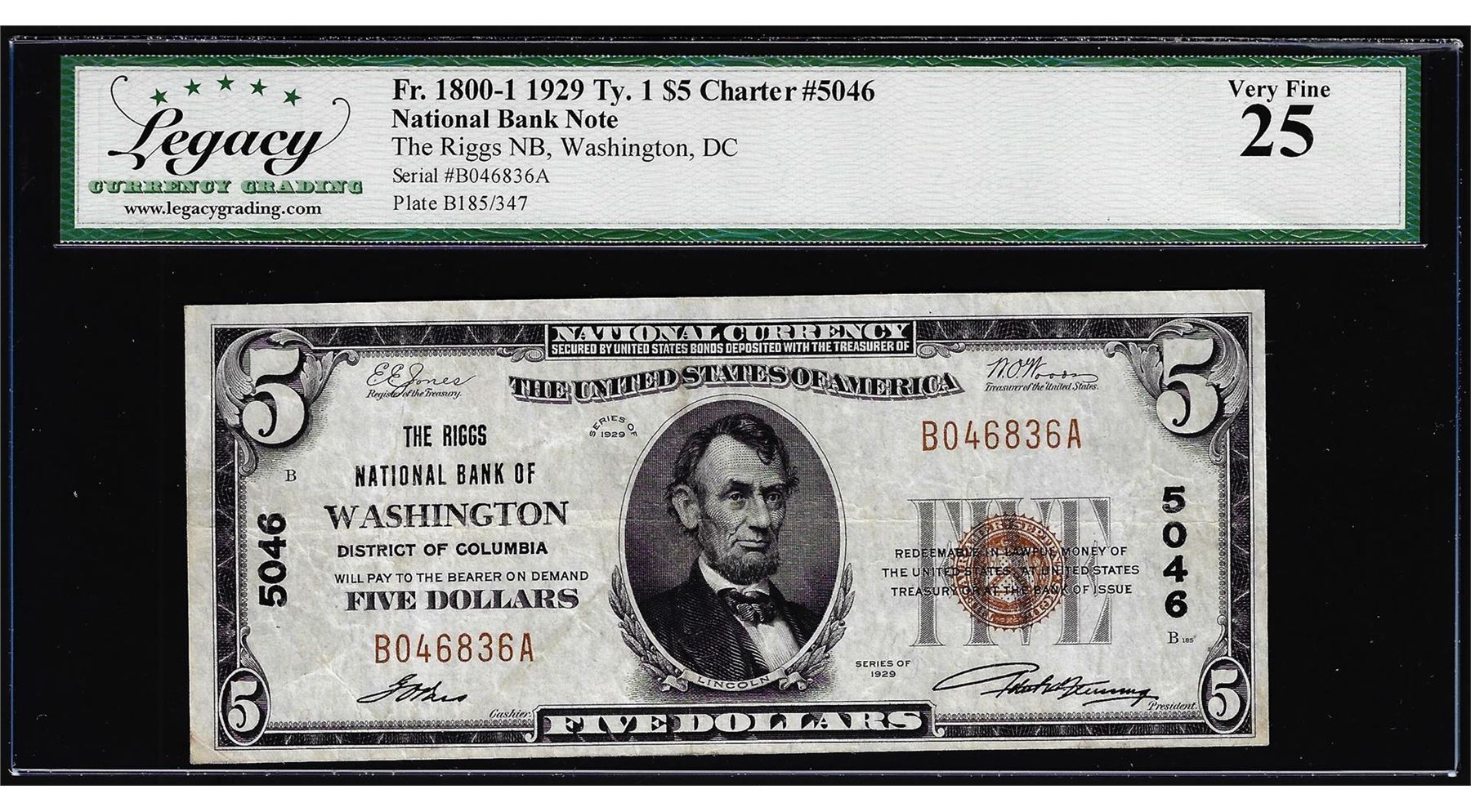 One 1929 $5 NB Washington, DC CH# 5046 National Currency Note Legacy Very Fine 25. Legacy Graded.