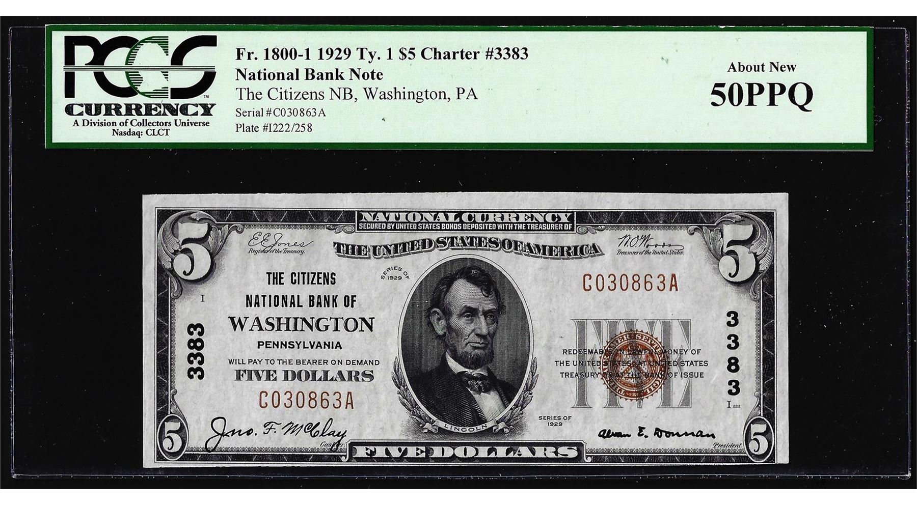 One 1929 $5 NB of Washington, PA CH# 3383 National Currency Note PCGS About New 50PPQ. PCGS Graded.