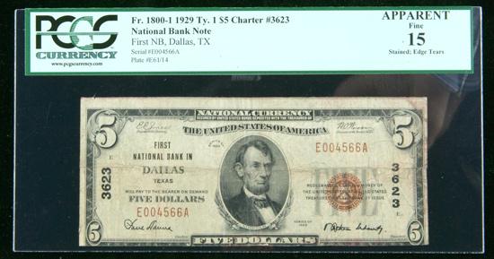 1929, $5 National Bank Note. First NB in Dallas, TX. PCGS Apparent Fine 15. . Fr-1800-1. Although moderately stained and with a few edge tears as noticed by PCGS Currency, this is otherwise a solid-looking example from a popular locale.