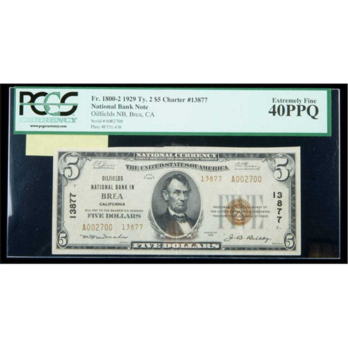 1929, $5 National Bank Note. Oilfields NB, Brea, CA. Ch. #13877. PCGS Extremely Fine 40PPQ. . Fr-1800-2. This lovely and original three-fold "XF" is likely one of a small and long since dispersed hoard of $5 Type 2 examples which make up the overwhelming majority of the reported notes from here. A PCGS Currency graded Choice About New 58PPQ of the same denomination from this bank sold for $12,000 last February. While we don't expect the same realization from this piece today, the popularity of this locale should keep the bidding going until it reaches or exceeds our estimate.