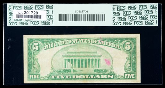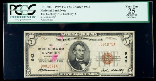 1929, $5 National Bank Note. The Danbury NB, Danbury, CT. Ch. #943. PCGS Very Fine 25 Apparent. . Fr-1800-1. Only eleven examples are listed in the National Bank Note Census. The Apparent grade was assigned due to ink stains.