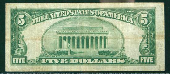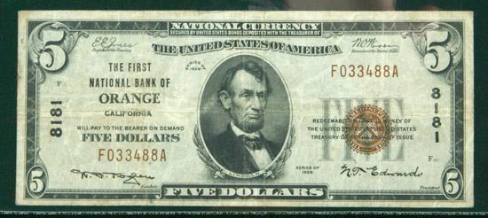 1929, $5 National Bank Note. The First NB, Orange, CA.