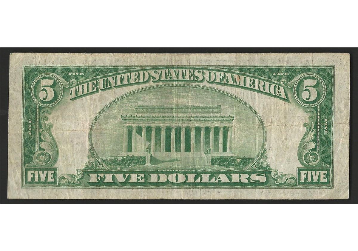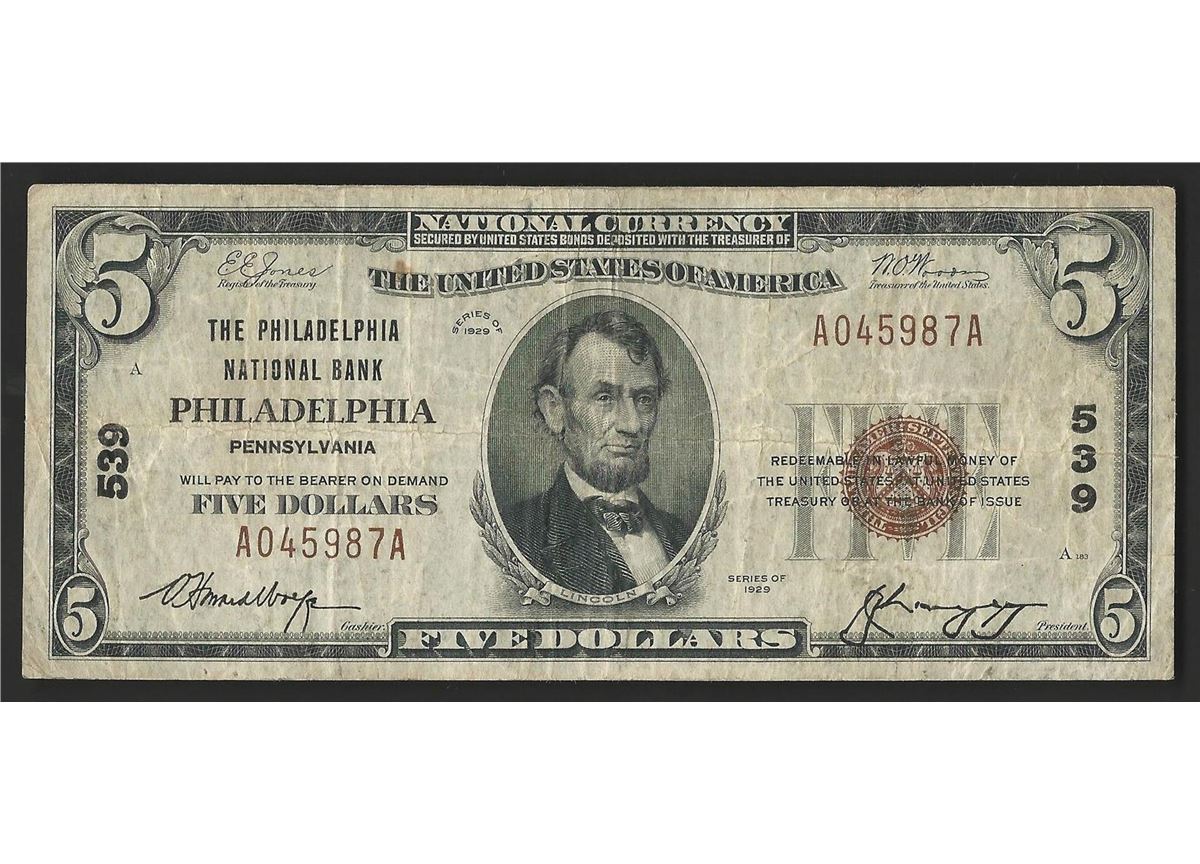 1929 $5 National Bank Note of Philadelphia Pennsylvania Charter #539