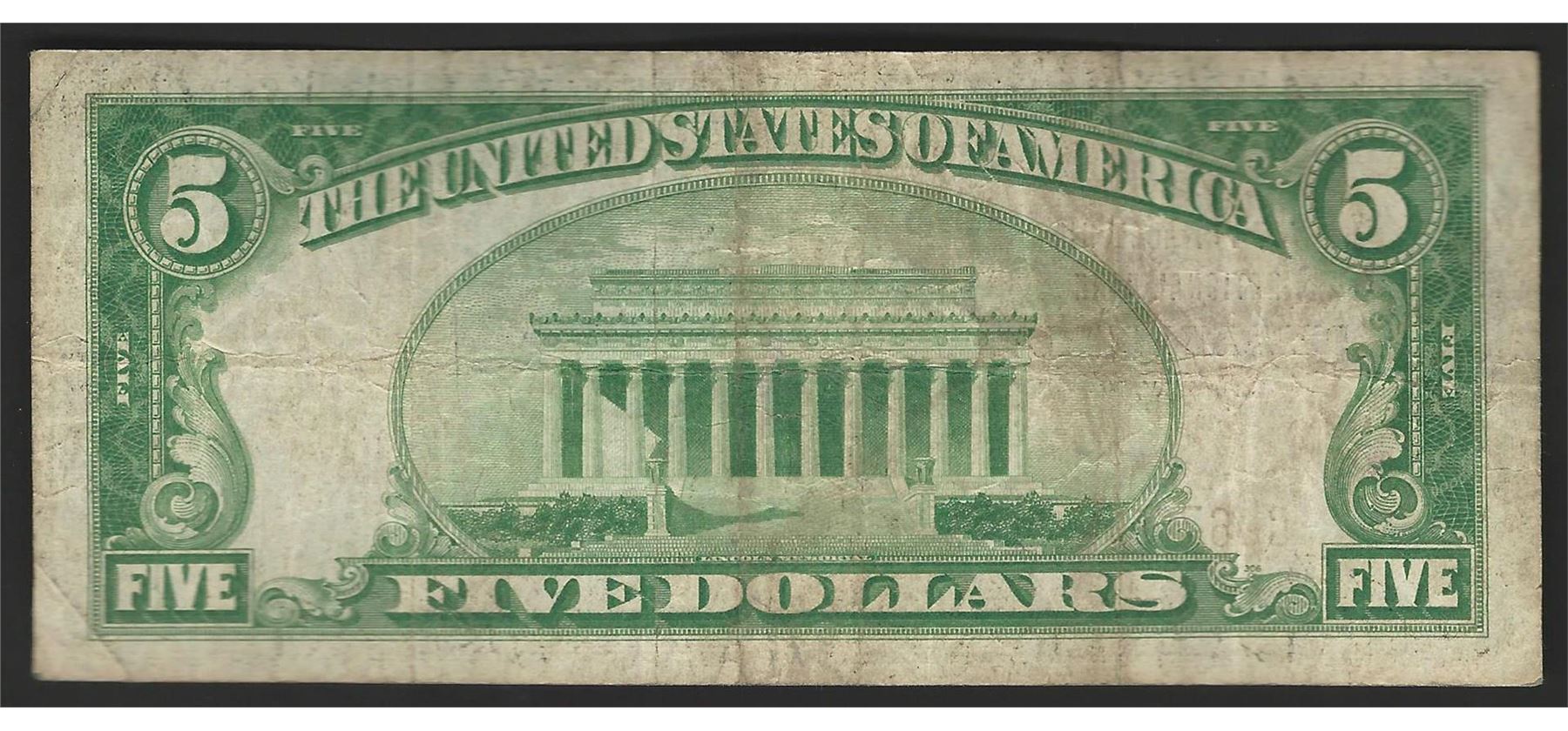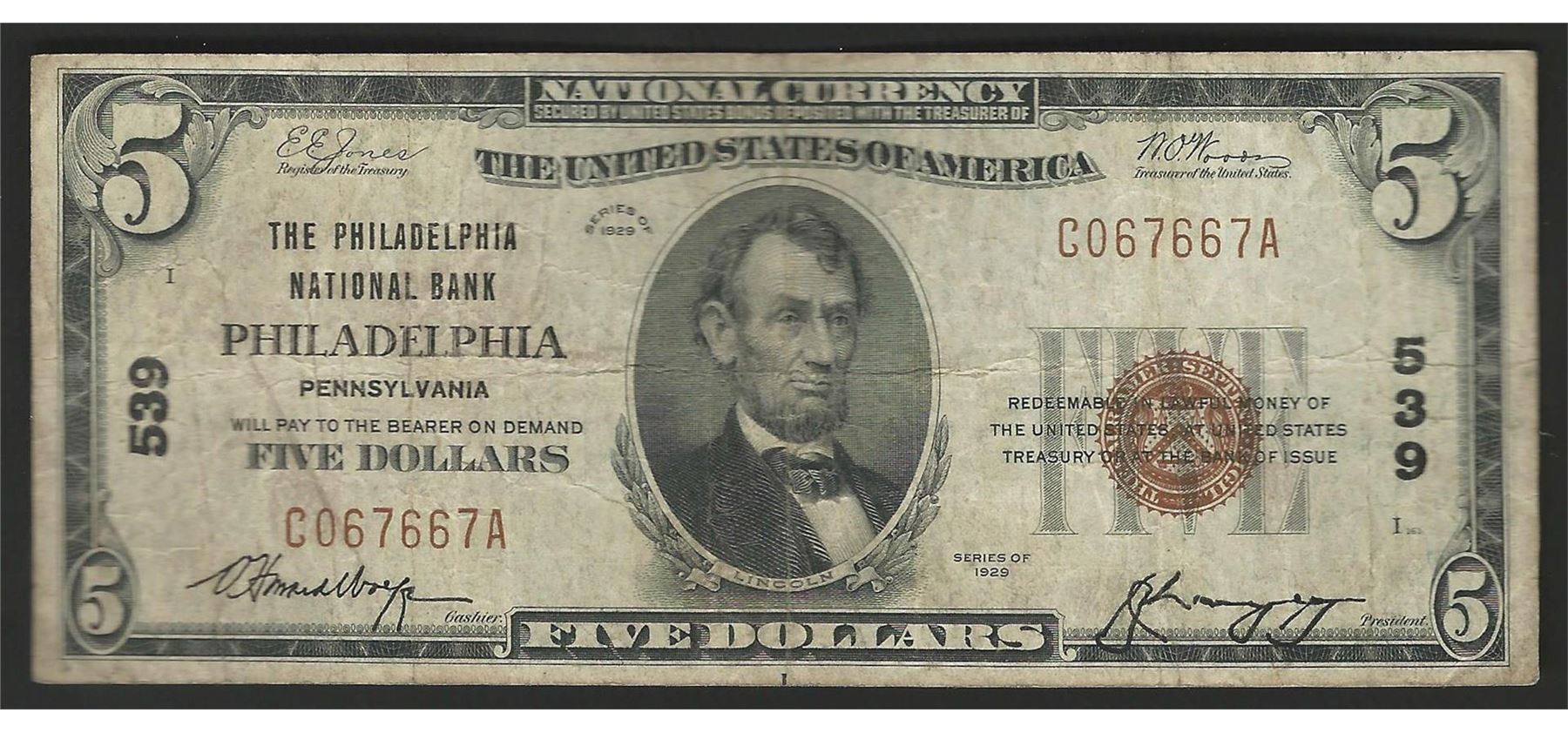 1929 $5 National Bank Note of Philadelphia Pennsylvania Charter #539