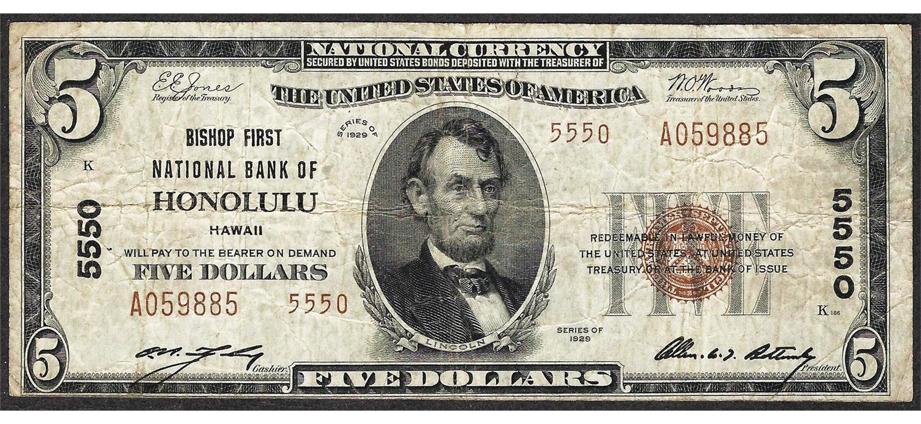 One 1929 $5 National Currency Note Bishop NB of Honolulu, HI CH# 5550.