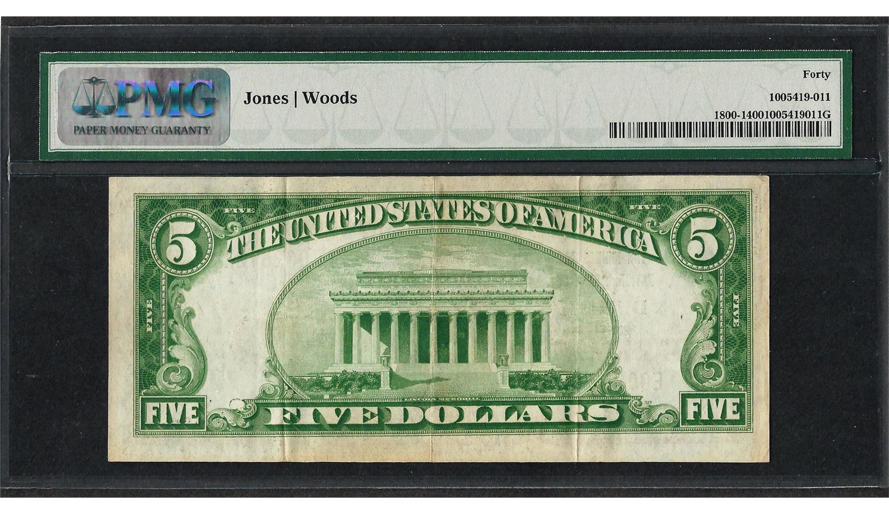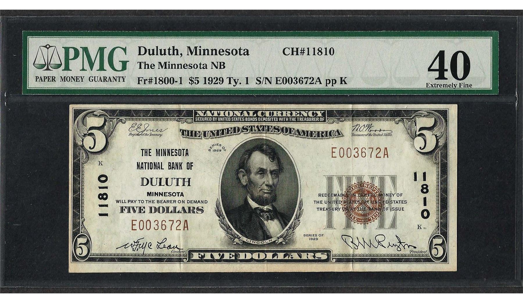 One 1929 $5 National Currency Note Duluth, MN CH# 11810 PMG Extremely Fine 40. PMG Appraised.