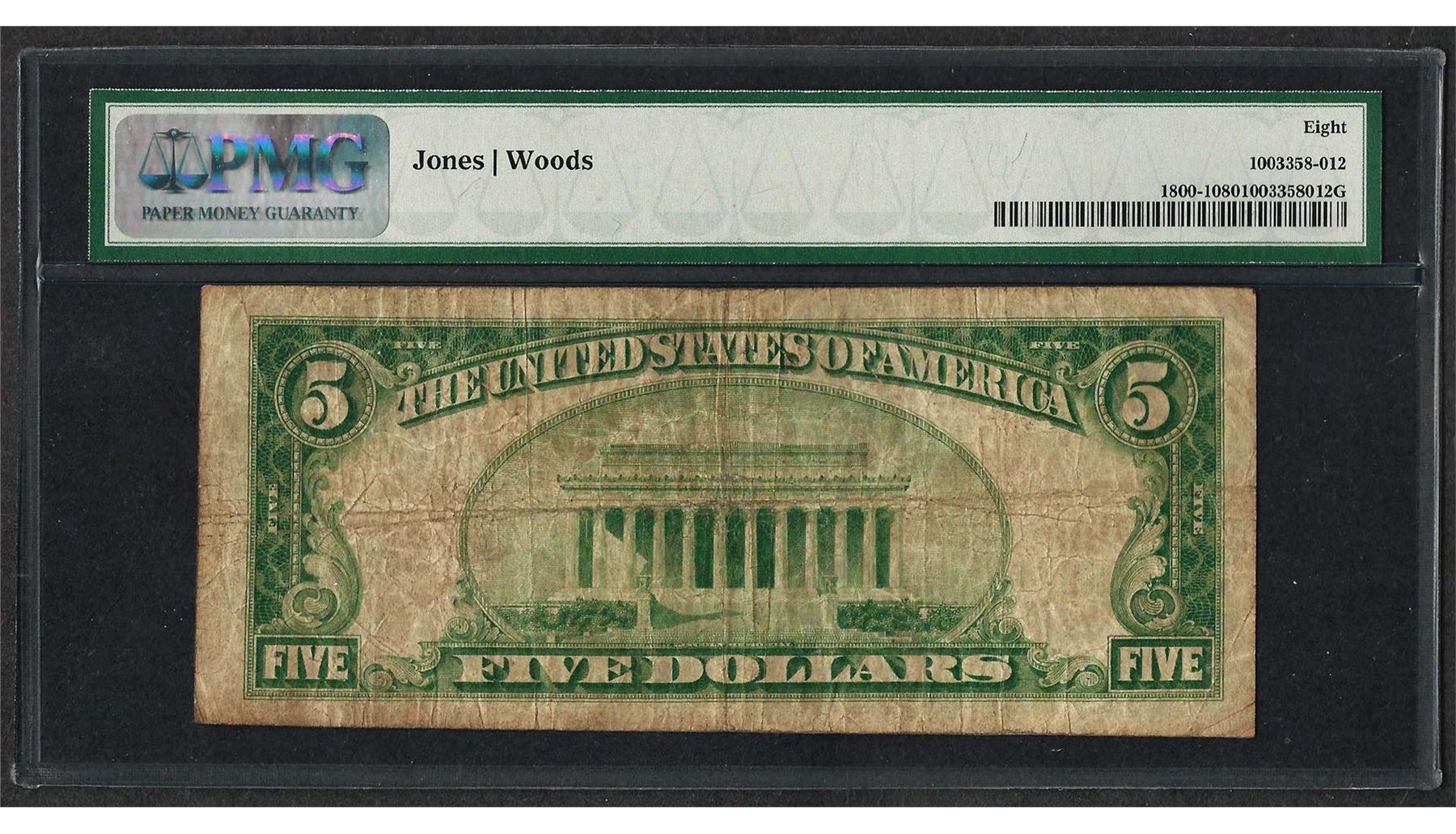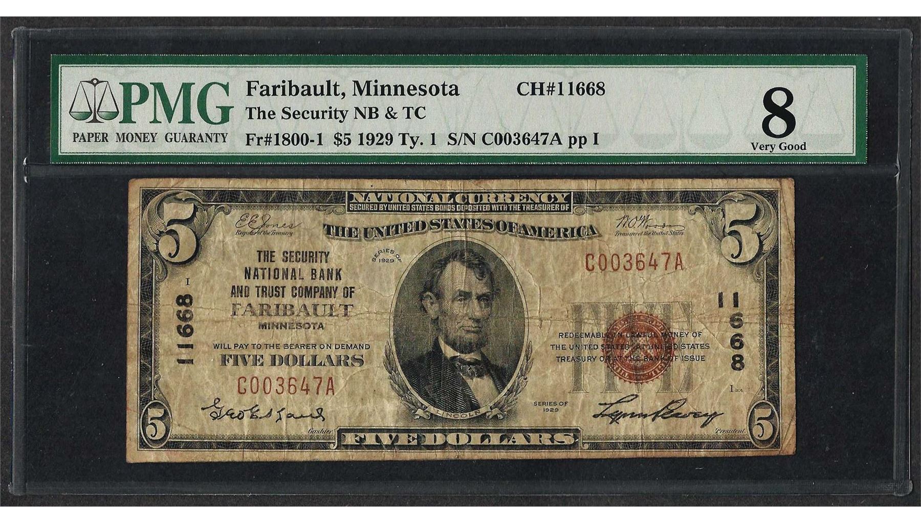 One 1929 $5 National Currency Note Faribault, MN CH# 11668 PMG Very Good 8. PMG Certified.