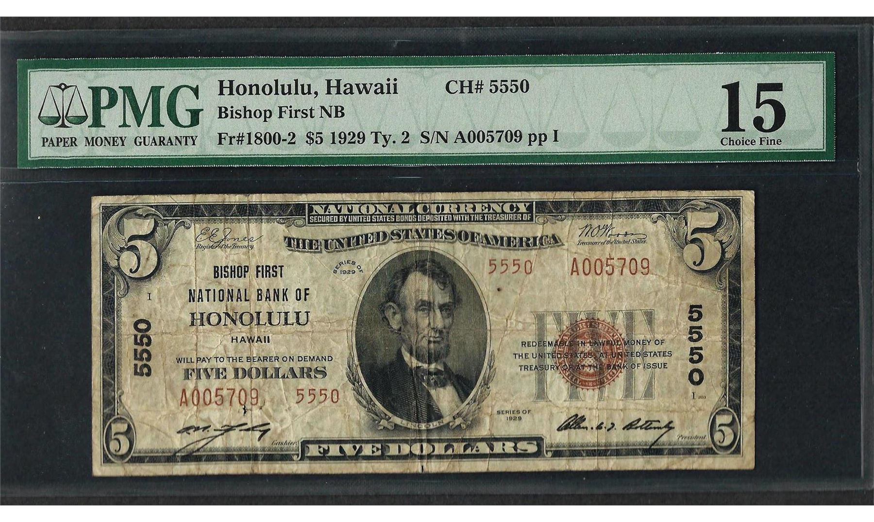 One 1929 $5 National Currency Note Honolulu, HI CH# 5550 PMG Choice Fine 15. PMG Certified.