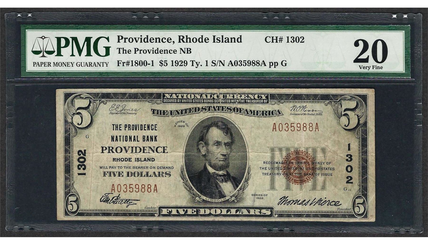 One 1929 $5 National Currency Note Providence, Rhode Island CH# 1302 PMG Very Fine 20. PMG Certified.