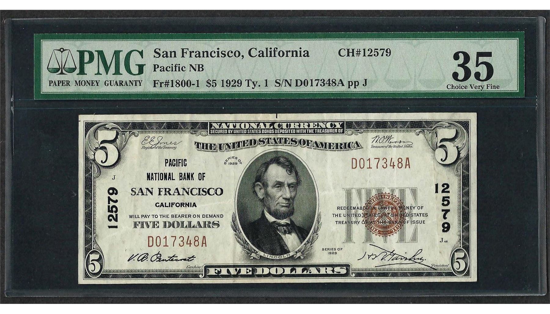 One 1929 $5 National Currency Note San Francisco, CA CH# 12579 PMG Choice Very Fine 35.