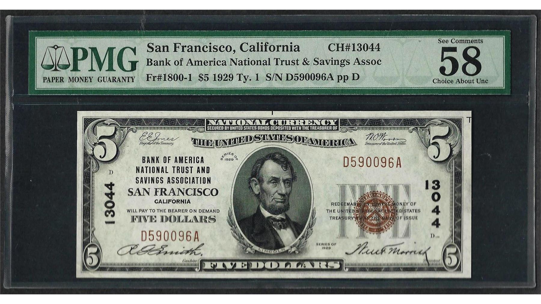 One 1929 $5 National Currency Note San Francisco, CA CH# 13044 PMG Choice About Unc. 58EPQ. PMG Certified.