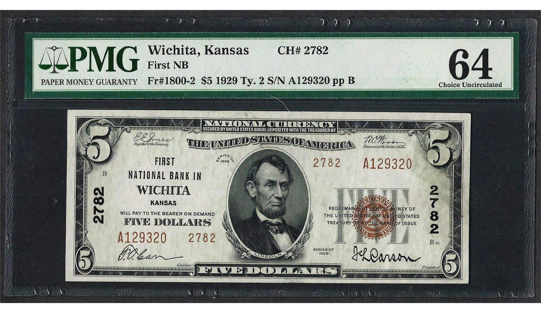 One 1929 $5 National Currency Note Wichita, KS CH# 2782 PMG Choice Uncirculated 64. PMG Certified.