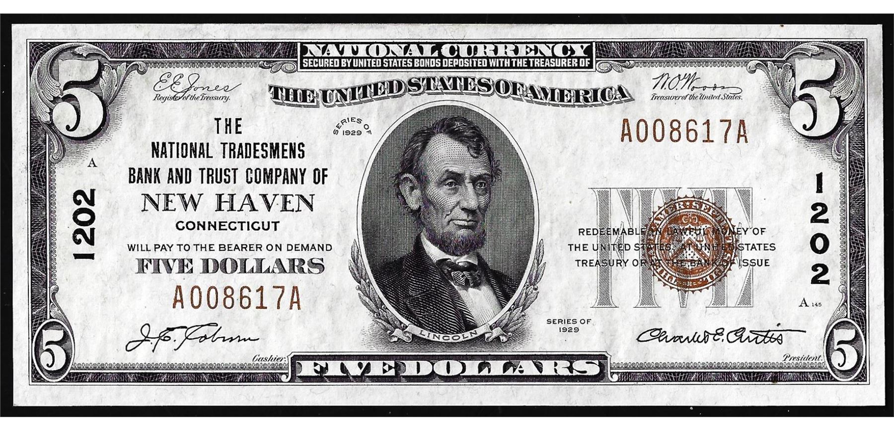 One 1929 $5 National Tradesman Bank of New Haven, CT CH# 1202 National Currency Note.