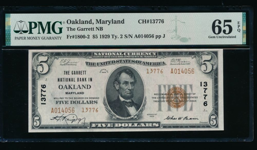 One 1929 $5 Oakland MD National PMG 65EPQ .