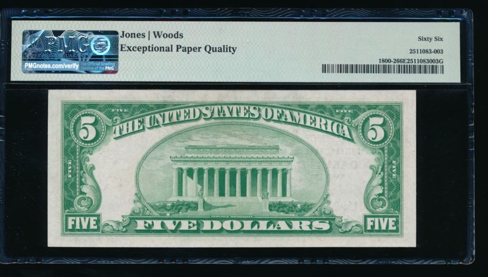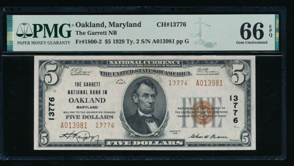 One 1929 $5 Oakland MD National PMG 66EPQ.