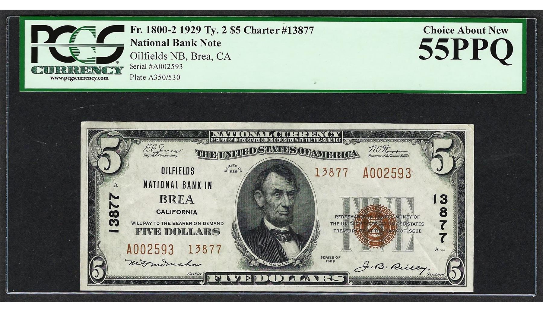 One 1929 $5 Oilfields NB in Brea, CA CH# 13877 National Currency PCGS Ch. About New 55PPQ. PCGS Graded.